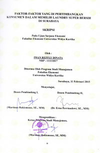Penelitian ini bertujuan untuk mengetahui tentang faktor-faktor yang di pertimbangkan konsumen dalam memilih Laundry Super Bersih di Surabaya. Data penelitian ini diperoleh dengan menyebarkan kuesioner kepada 100 konsumen yang menggunakan Jasa Laundry Super Bersih di Surabaya. Jenis penelitian ini adalah penelitian deskriftif. Teknik pengambilan sampel menggunakan Accidental Sampling yaitu teknik pengambilan sampel dapat dilakukan sewaktu-waktu sampai jumlah sampel yang diinginkan terpenuhi. Dari data yang terkumpul menunjukan bahwa dari 33 pernyataan yang diolah menggunakan program SPSS versi 20.0 for windows dan dianalisa menggunakan model Dimention rotation (analisis faktor), dengan hasil ada 4 faktor yang terbentuk dan di pertimbangkan konsumen dalam memilih laundry Super Bersih yaitu faktor bauran pemasaran, faktor kekuatan, faktor diskon, dan faktor keunikan.