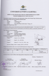 Dalam skripsi ini, penulis menjelaskan teori tentang kata pelengkap arah sederhana dan menganalisa kesalahan penggunaan kata pelengkap arah sederhana ini. Dalam belajar bahasa mandarin, mahasiswa Universitas Widya Kartika Surabaya masih sering terpengaruh oleh bahasa ibu, sehingga sebagian besar dari mereka merasa kesusahan dalam mempelajari kata pelengkap arah sederhana yang terdapat pada bahasa Mandarin tetapi tidak ada pada tata bahasa Indonesia. Oleh karena itu, dalam tugas akhir ini penulis menganalisa jenis-jenis kesalahan yang masih dilakukan mahasiswa Universitas Widya Kartika Surabaya dan faktor-faktor apa saja yang ternyata mempengaruhi mereka dalam melakukan kesalahan ini. Dan disini penulis akan memberikan beberapa tips sederhana untuk mengurangi kesalahan dalam pemakaian kata pelengkap arah sederhana. Penulis berharap skripsi ini dapat membantu mahasiswa Universitas Widya Kartika Surabaya untuk lebih memahami penggunaan kata pelengkap arah sederhana dengan baik dan benar. Dan untuk selanjutnya mereka mampu mengaplikasikan dan mempraktekkannya pada saat mentransferkan pemahaman ini di masa depan.